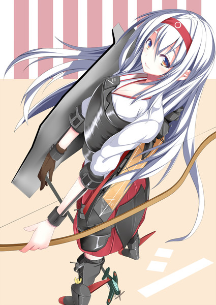 ・基本的に胸当てとグローブ、足のバルジは外して身軽な状態が多い。例外としては演習場などで矢を射ったり、演習したりするときなど。バルジをパージしているので普通のロングブーツのような形になっている。紅白の巫女服に赤い鉢巻きを巻いて胸前の合わせは普段はしっかりと閉じている。